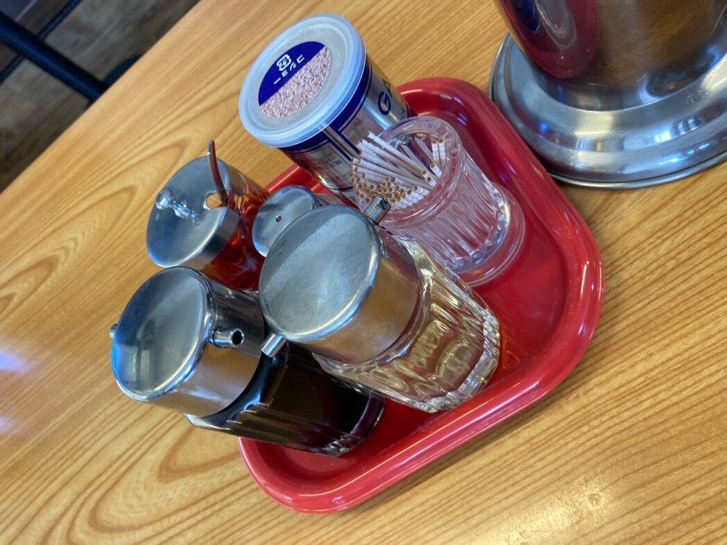 醤油、酢、ラー油の餃子3点セットと、塩、コショウ。
